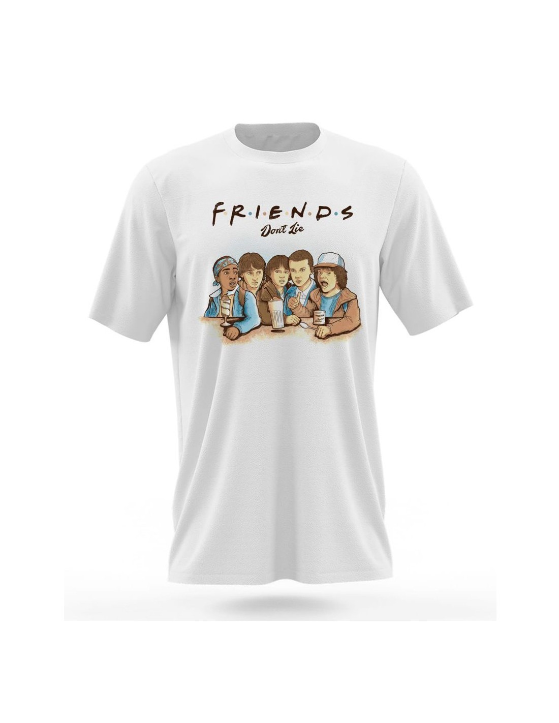 Stranger Things Friends Don't Lie camiseta blanca de manga corta de adulto. Algodón 100%.