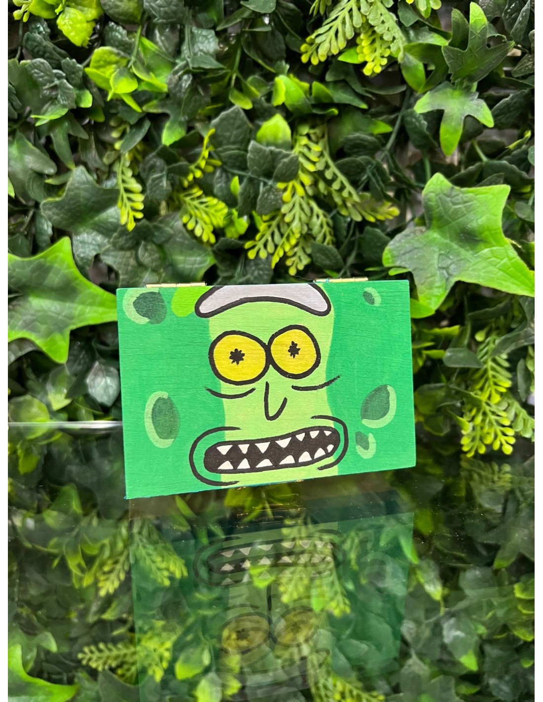 Caja de madera pintada a mano de Rick Pepinillo de la serie Rick y Morty.