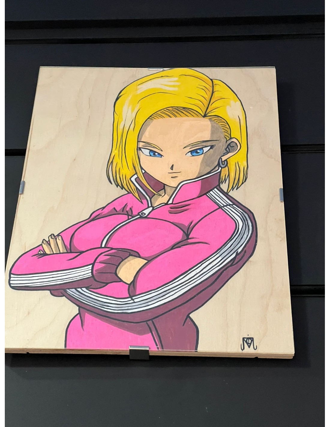 Cuadro de madera pintado a mano de C-18 del manga y anime Dragon Ball.
