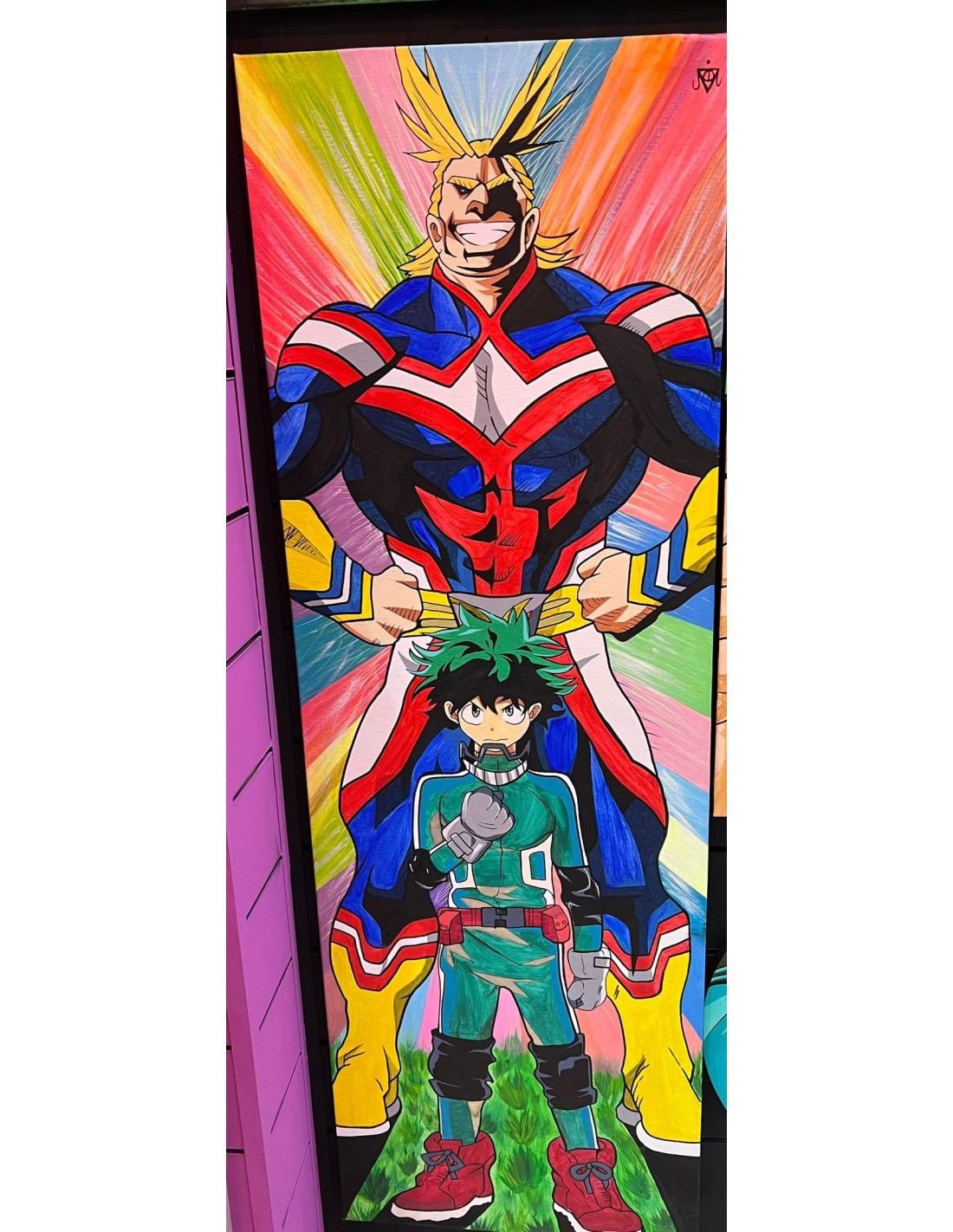 Lienzo pintado a mano de Izuku Midoriya junto a All Might del maga y anime My hero Academia.