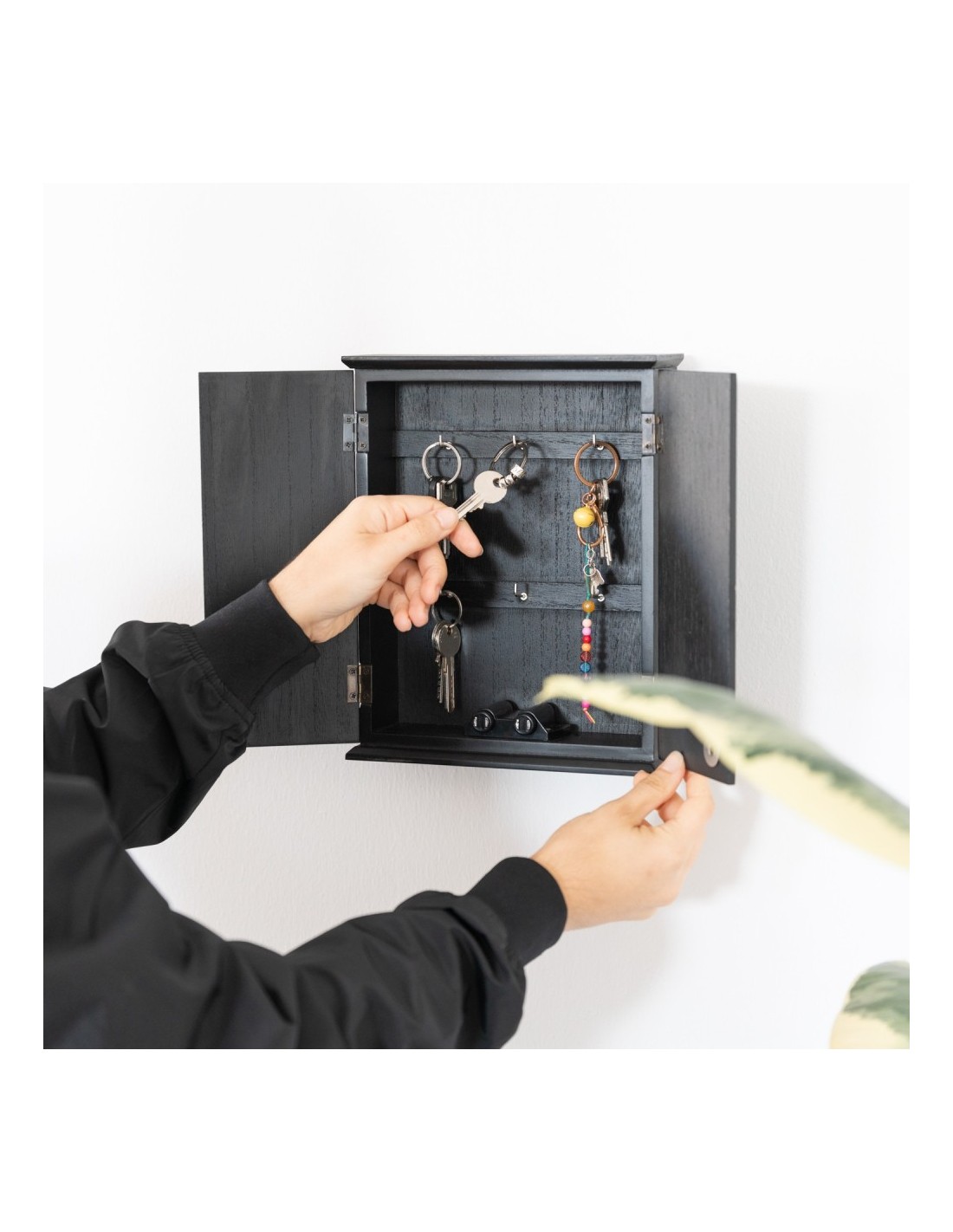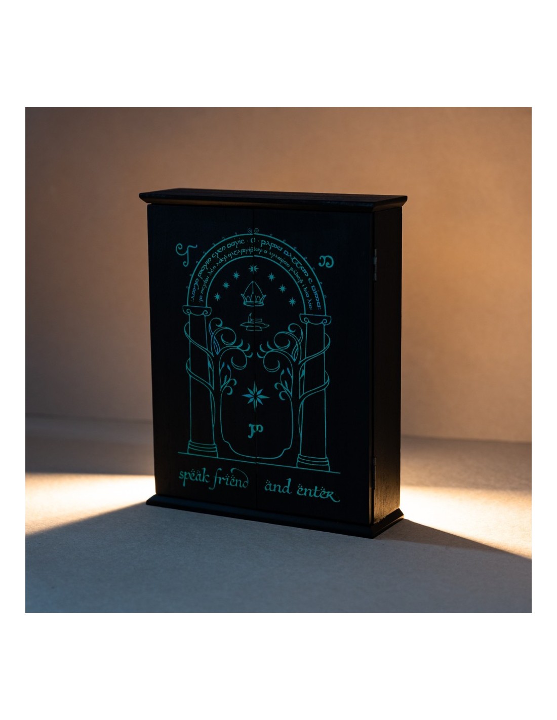 Colgador de llaves con capacidad para seis llaveros. Cuenta con un diseño impreso con tinta luminiscente, lo que permite que se ilumine en la oscuridad después de absorber luz natural o ultravioleta (UV). Incluye un sistema de cierre magnético con pulsador para una cómoda apertura y cierre de las puertas. Dispone de anclajes en la parte trasera para facilitar su instalación en la pared. Materiales: MDF y aluminio. Medidas: 21 x 26 x 6 cm.