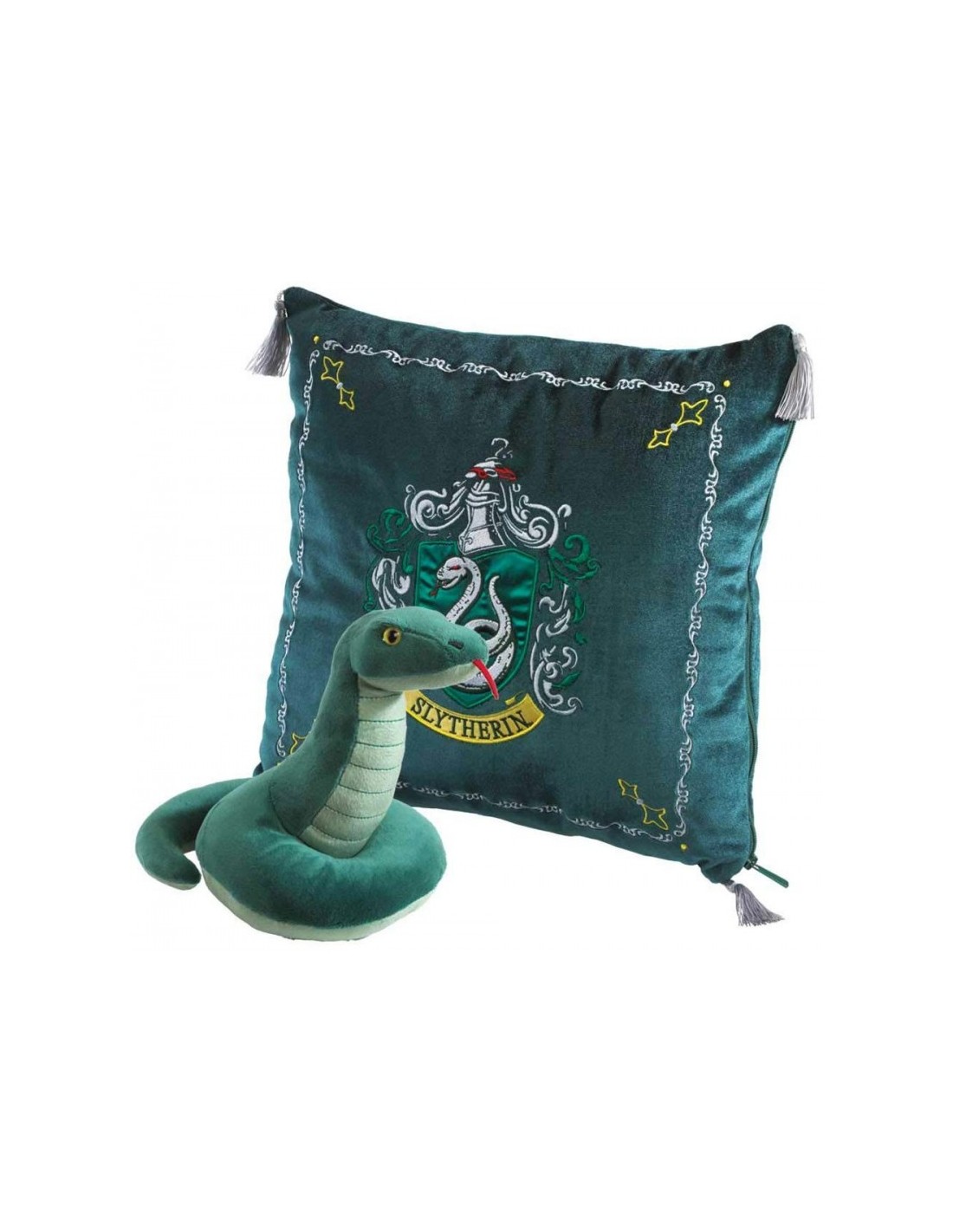 Este set se compone por un lado de un elegante cojín, con unas medidas aproximadas de unos 31 x 31 x 15 cm, y el escudo de Slytherin reproducido con todos los detalles del original, mientras que en su interior podrás encontrar un precioso peluche de una serpiente, el animal representativo de la casa Slytherin.