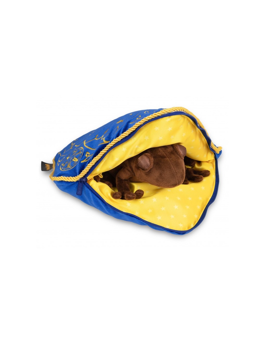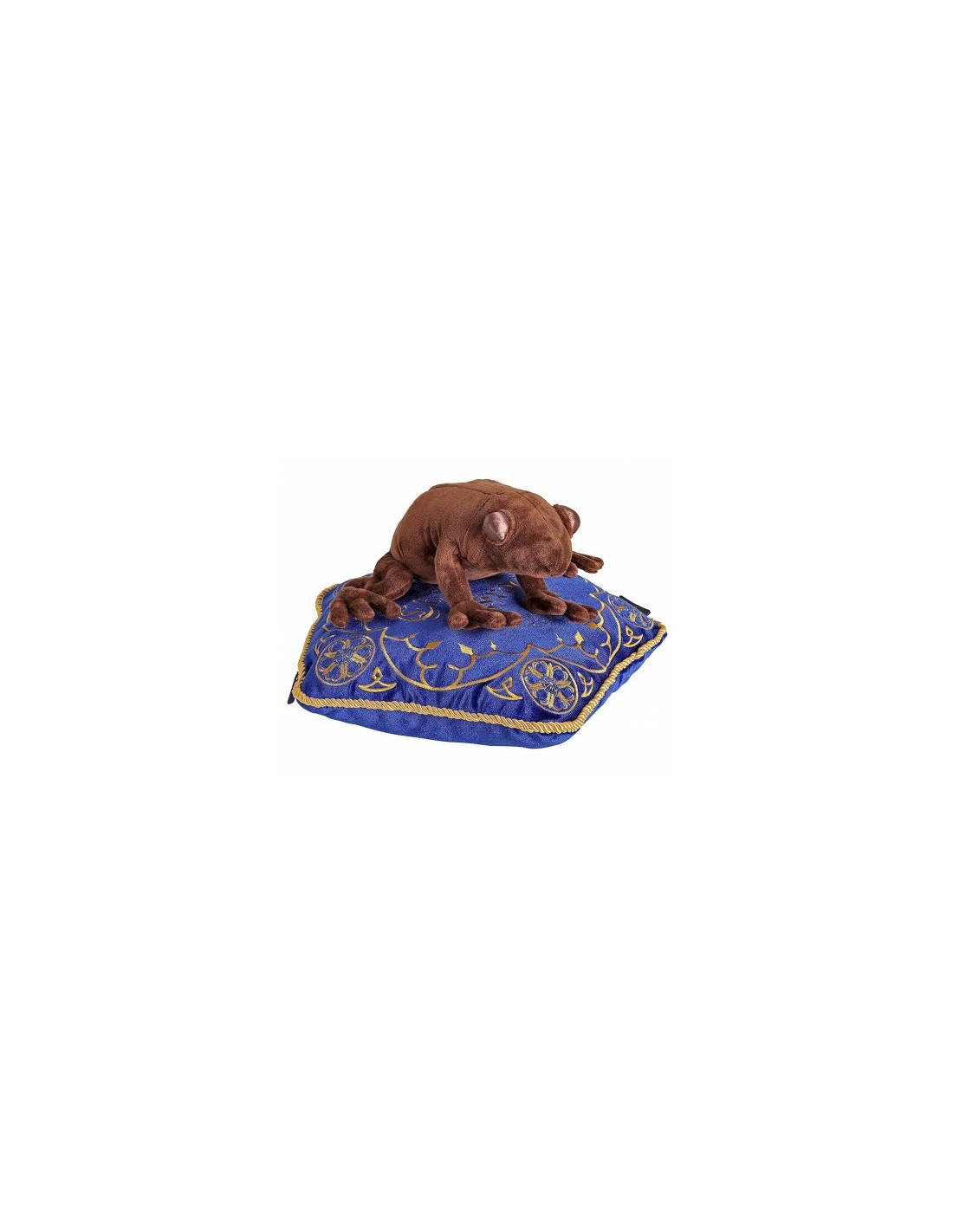 Por un lado tenemos un cojín aproximada de unos 36 x 36 x 11 cm, con la forma en 3D de la mítica cajita de las ranas de chocolate, en cuyo interior hay un peluche que tiene precisamente la forma y colores de estos dulces tan famosos que puedes encontrar en el Hogwarts Express, el famoso tren que lleva a Hogwarts a sus alumnos.