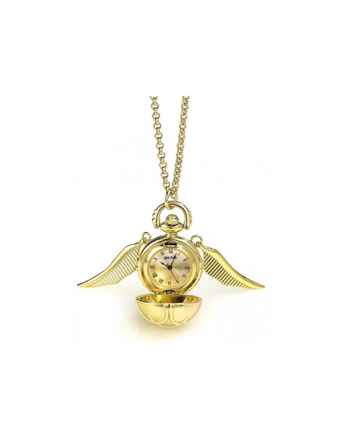 Se trata de un delicado colgante diseñado por la prestigiosa casa The Carat Shop, fabricada en aleación de zinc chapada en oro. Es una pieza que mide aproximadamente 9,5 cm de ala a ala de la snitch. Y lo mejor es que es una snitch cuya pieza central se abre, porque en el corazón de esta snitch se esconde un precioso y delicado reloj. Viene además en un envase diseñado especialmente para esta pieza, ideal para regalar.