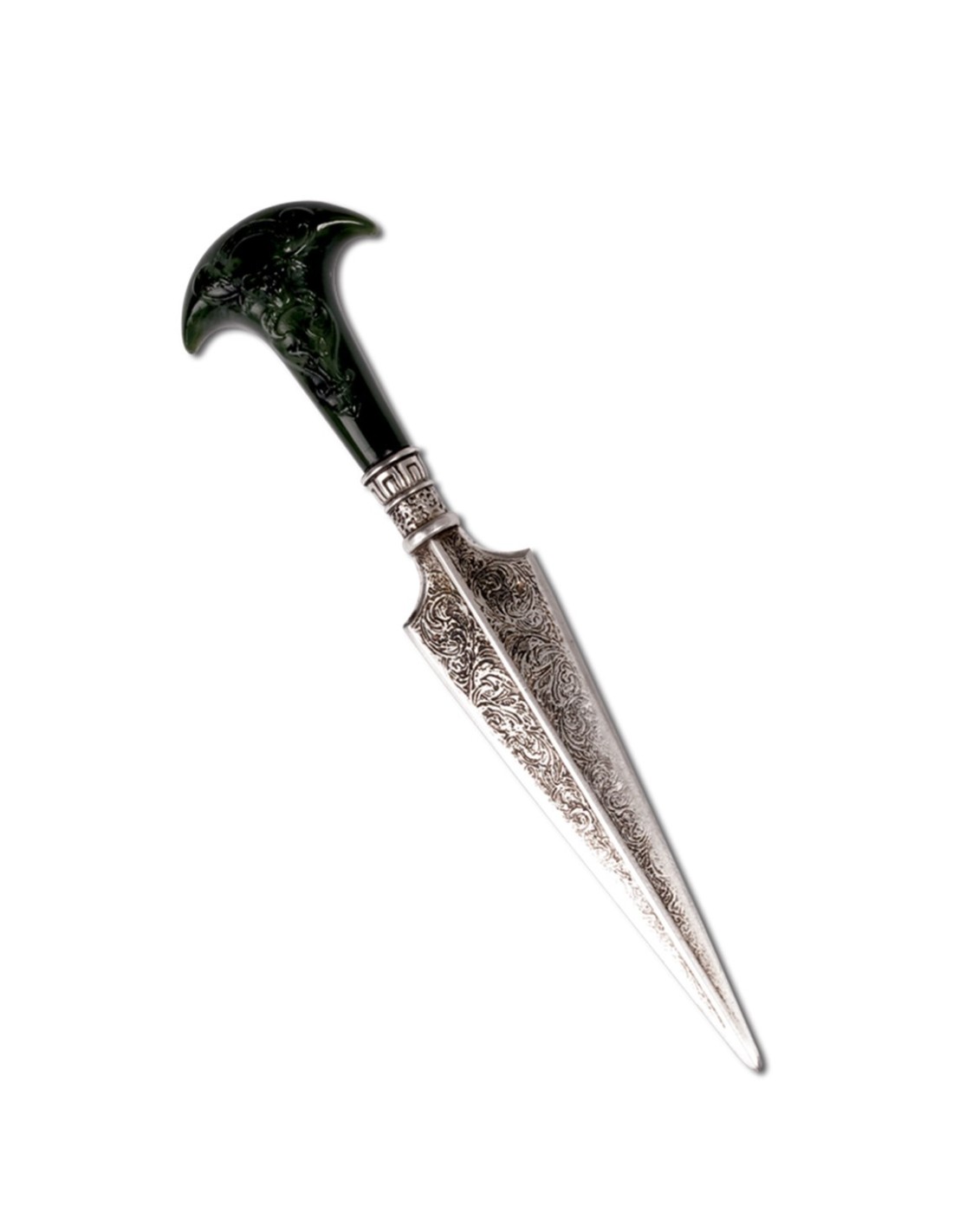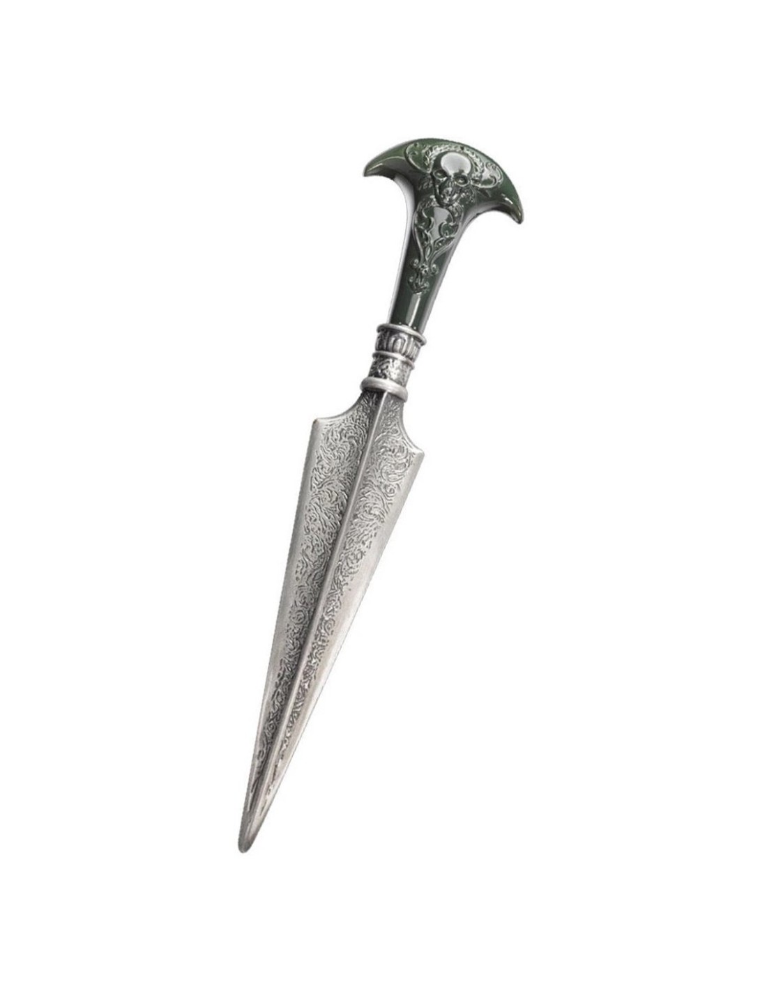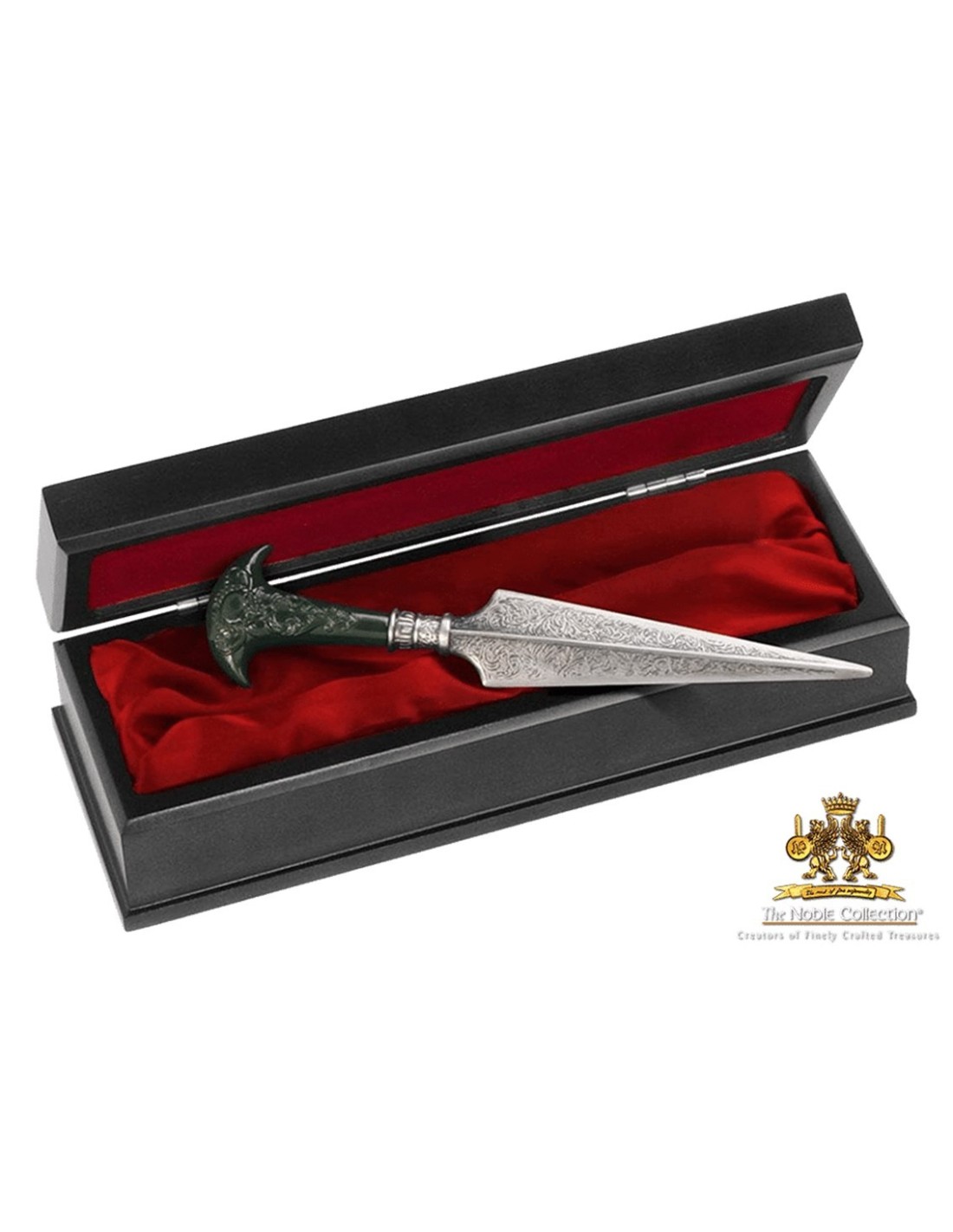 Réplica exacta y a escala real de la daga de Bellatrix Lastrange de Noble Collection en metal labrado. Mide 19 cm aproximadamente y se presenta en una caja de madera para coleccionistas. No juguete.