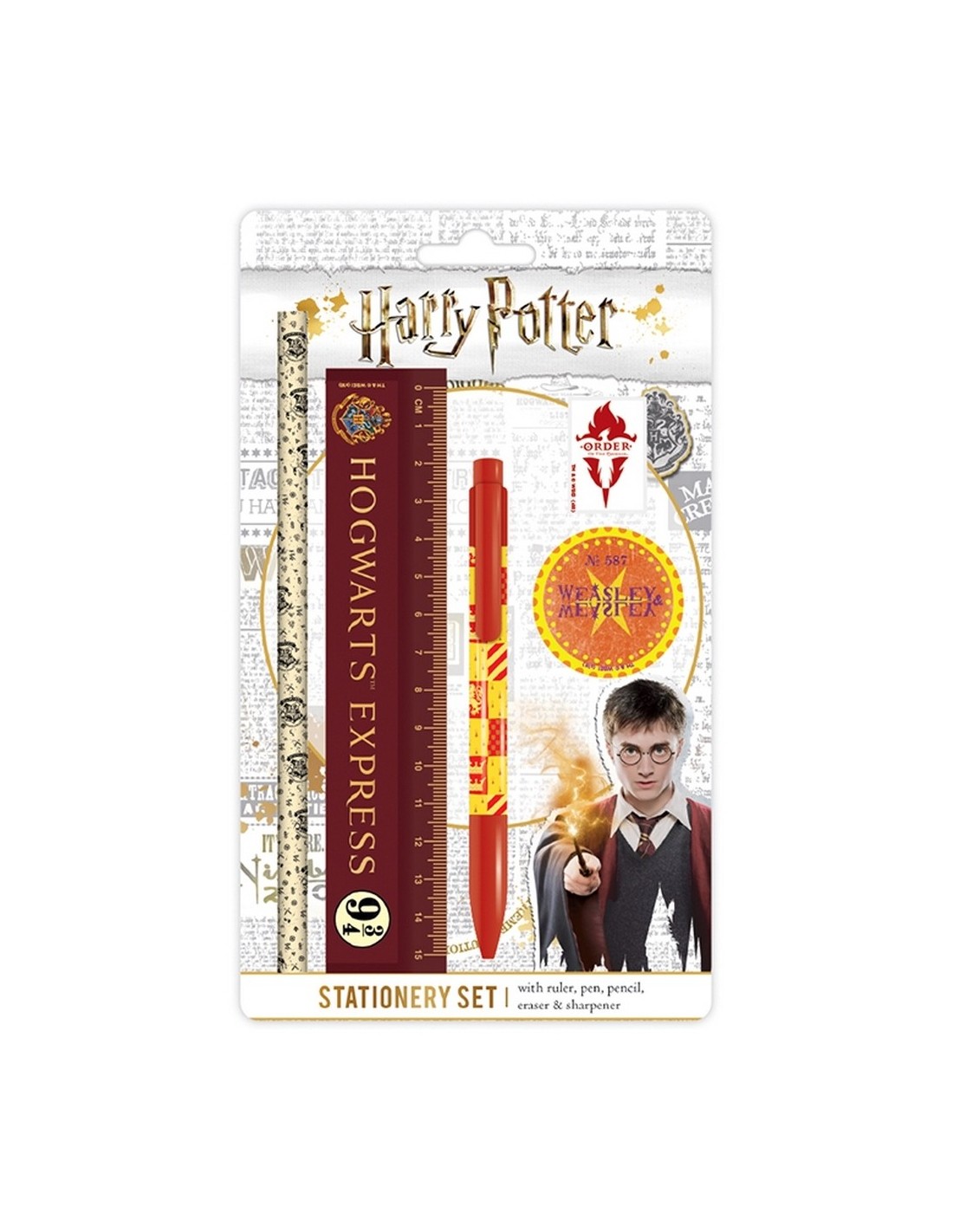 Set de papelería Harry Potter Hogwarts. Incluye: Lápiz, Goma de borrar, Bolígrafo, Regla y Sacapuntas.