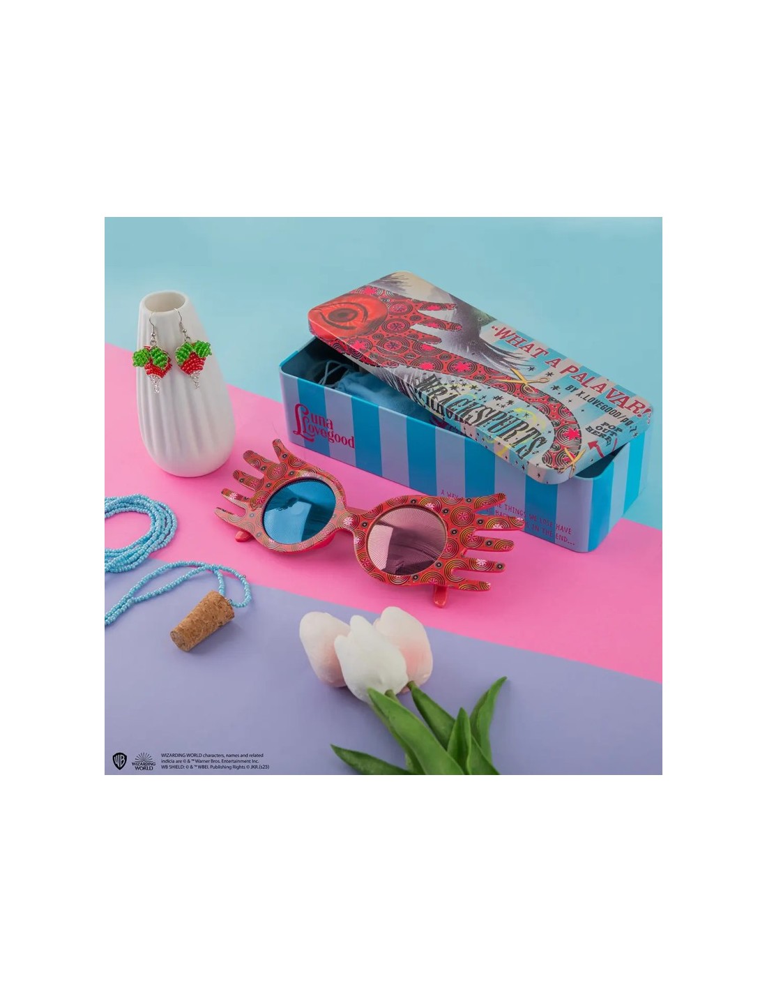 Se trata de un set de las espectrogafas y joyas de Luna Lovegood como los pendientes y el collar. Además viene con una caja metálica de regalo.