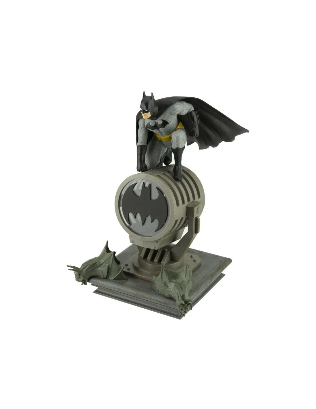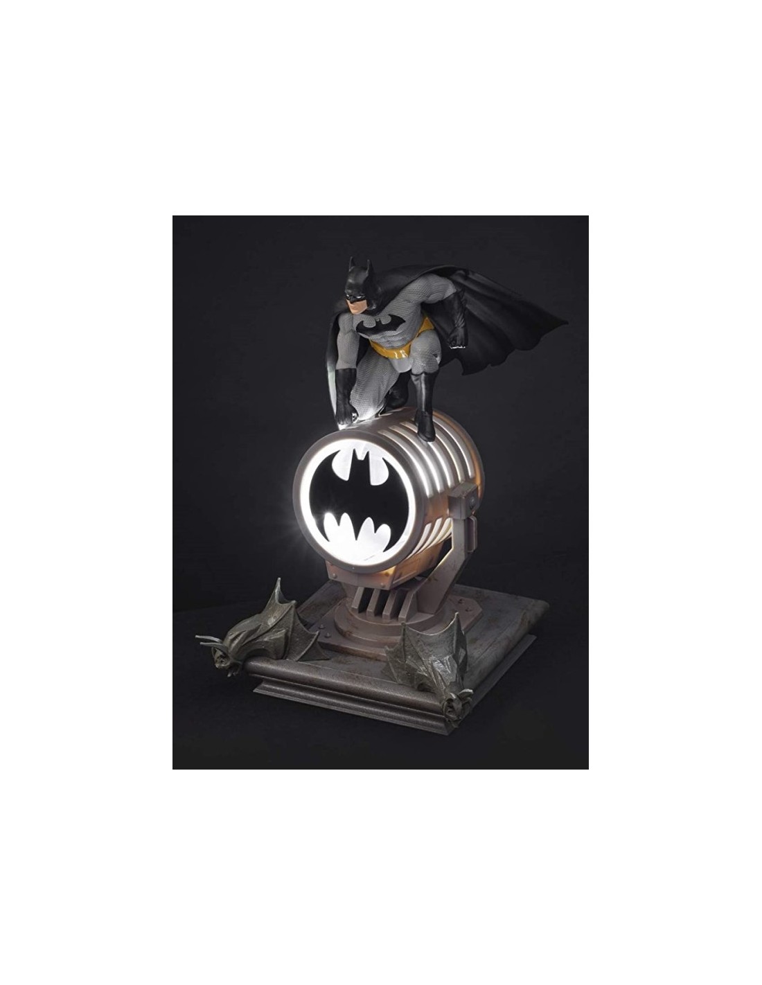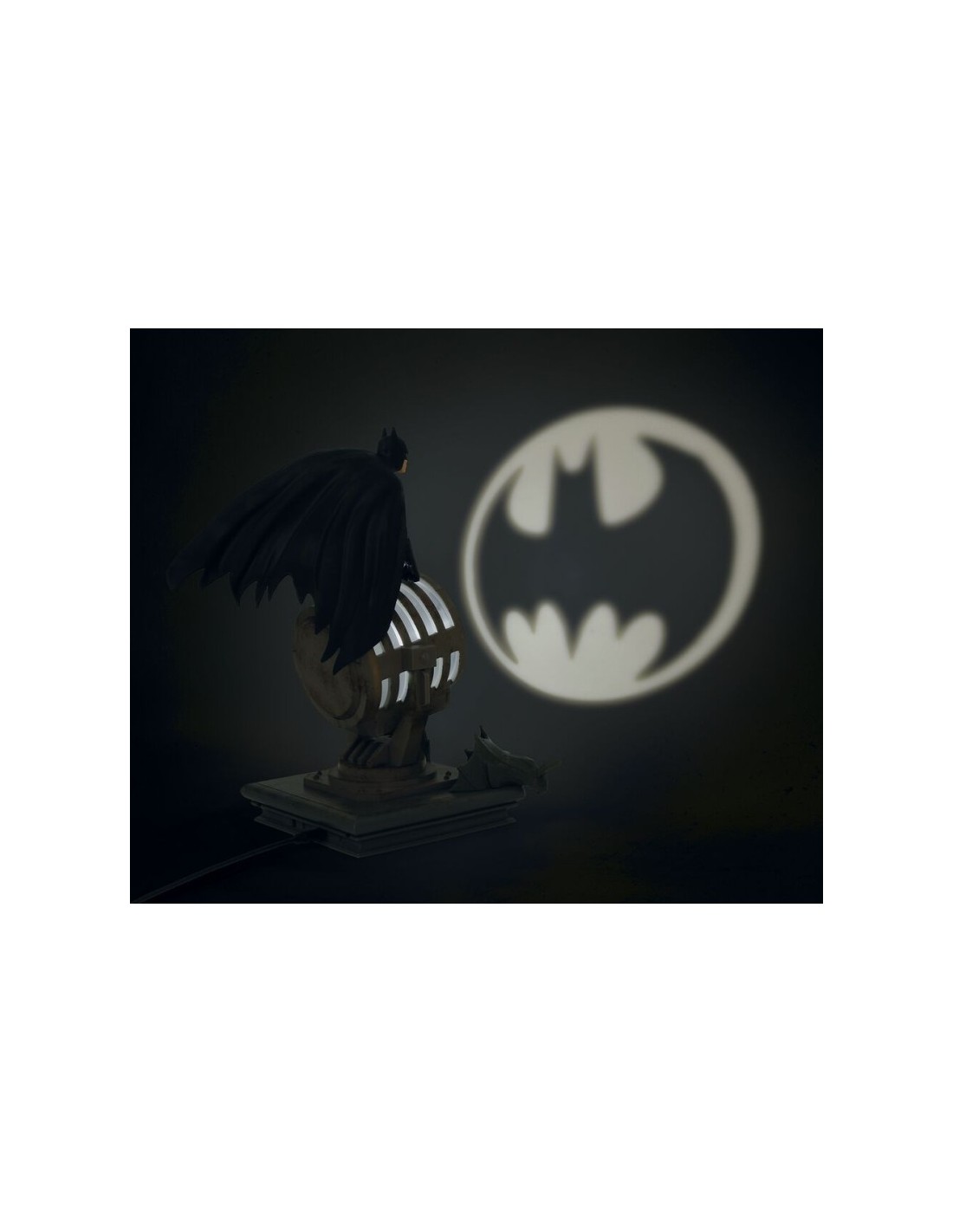 Pero lo mejor es que además es una detallada figura de Batman, con su traje clásico, subido sobre el foco que proyecta la batseñal y una base diorama que simula una de las cornisas de los edificios de Gotham, con las gárgolas incluidas. Mide aproximadamente 27 cm de alto, puede funcionar conectada a cualquier dispositivo o cargador USB, e incluye un cable USB.