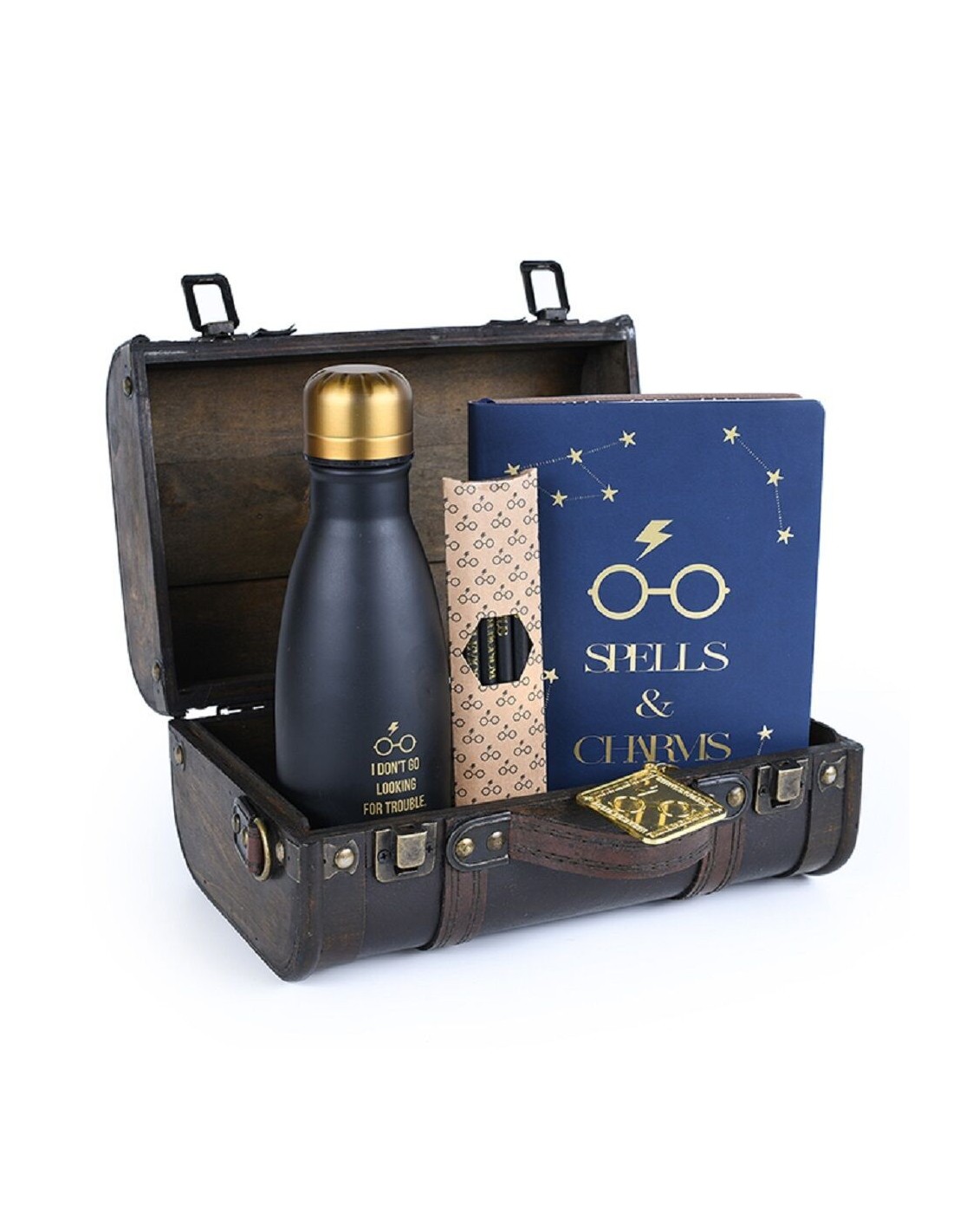 Pack de Regalo Premiun Harry Potter (Diseño Baúl Escuela Hogwarts) . Incluye Cuaderno PU, Botella metálica 350 ml., Llavero metálico, 4 lápices premium. Todos los elementos con diseños exclusivos para este conjunto. Dimensiones: 26 x 17 x 13 cm