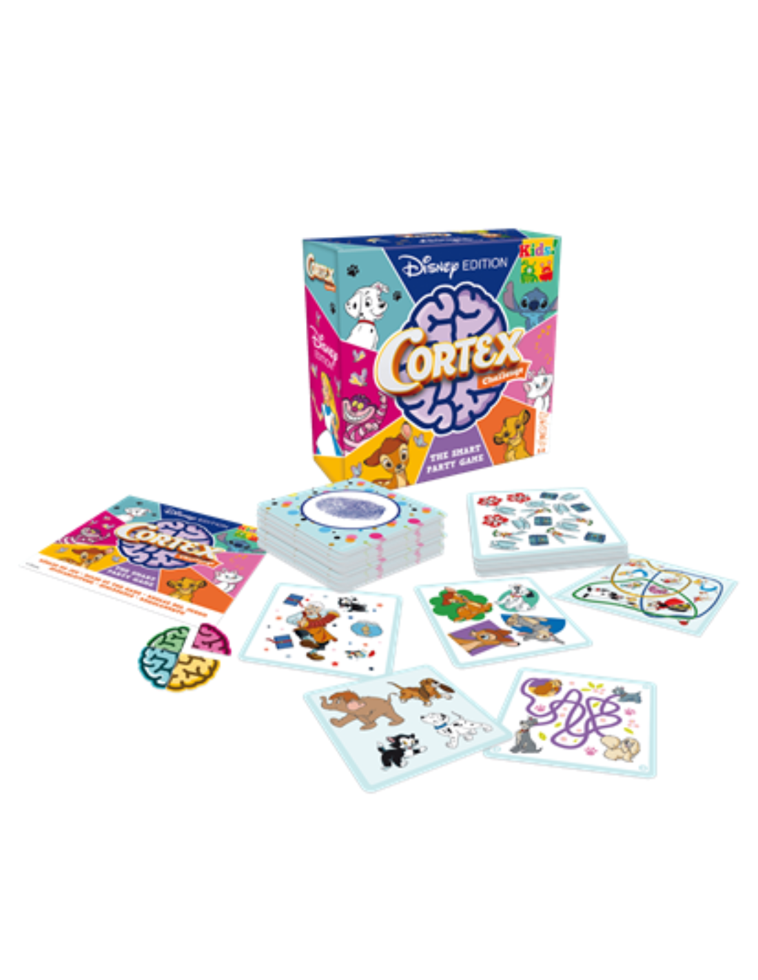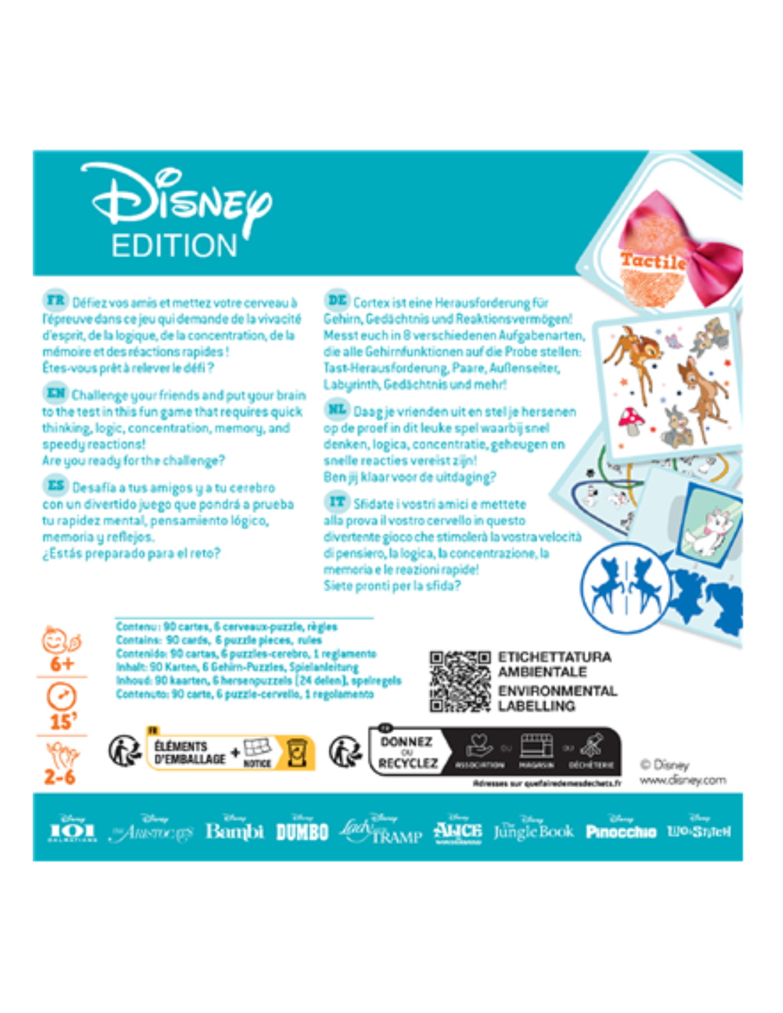 90 cartas (74 cartas Prueba, 6 cartas Desafío táctil, 10 cartas táctiles en relieve), 6 puzzles-cerebro (24 piezas).