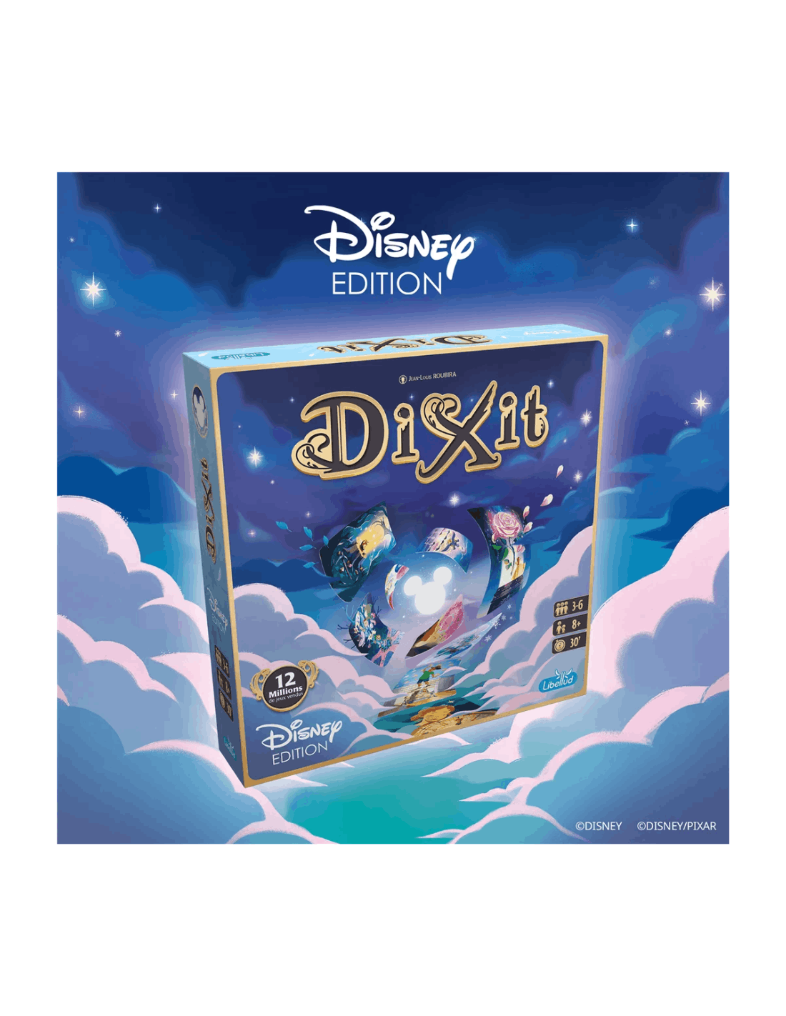 Un nuevo Dixit independiente con 84 nuevas cartas maravillosas, basado en las famosas películas de Disney y Pixar, desde Blancanieves a Red. Las mismas reglas de Dixit con nuevo material, de 3 a 6 jugadores, con tablero, diales de votación, fichas de madera... ¡Todo recubierto con la magia de Disney!