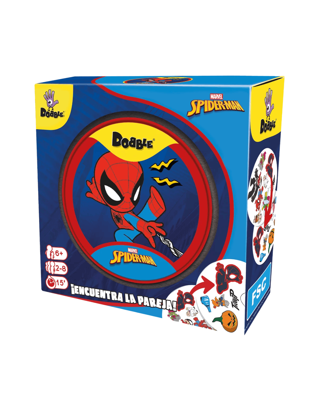 Sencillo, divertido y rápido: ¡Dobble es el juego definitivo de observación y velocidad para todos! Encuentra antes que nadie el único símbolo idéntico entre 2 cartas para ganar una carta o librarte de ella. ¡Descubre a Spiderman, Venom, Tía May y a muchos más de tus héroes y villanos favoritos de los cómics en 55 cartas ilustradas! ¿Podrás salvar a los neoyorquinos en el nuevo mini-juego Rescate en el metro?