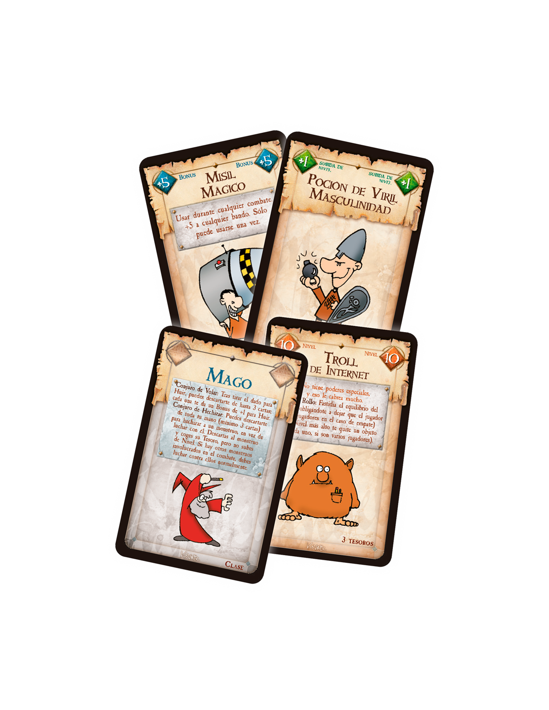 Este juego completo captura la esencia de la "Experiencia Dungeon" sin todas esas idioteces del rol. Todo lo que tienes que hacer es matar monstruos y coger objetos mágicos. ¡Y qué objetos mágicos! Ponte el Yyelmo Cornudo y las Botas de Invocación de Hemorroides. Blande el Báculo de Napalm o quizás la Motosierra de Mutilación Sangrienta. Empieza masacrando a la Planta en un Tiesto y a la Babosa Babeante, y encuentra la manera de llegar al Dragón de Plutonio. Munchkin es rápido de jugar y ridículo, y puede llevar a cualquier grupo de jugadores de rol a la risa histérica. Y mientras ríen, puedes robarles lo que lleven.