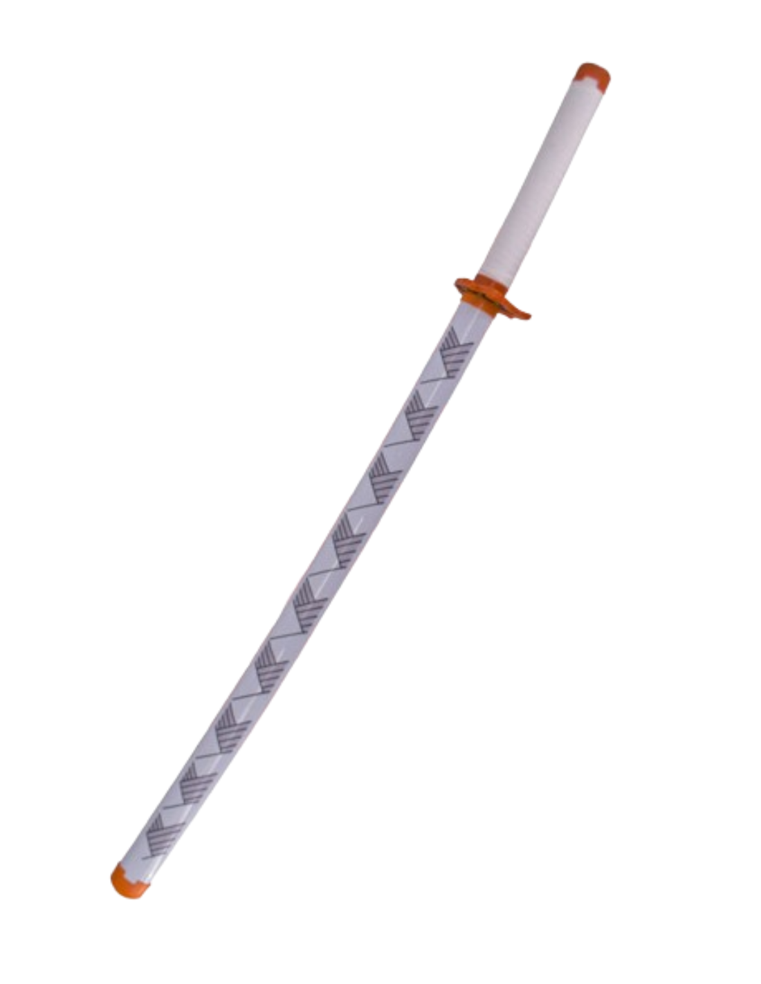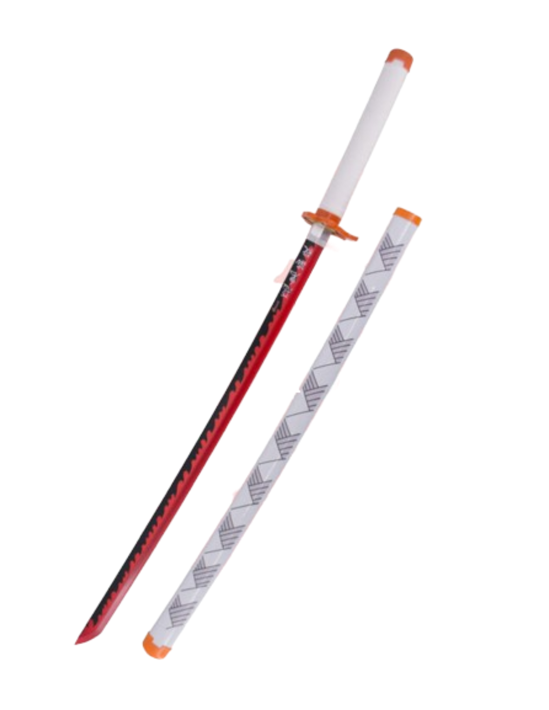 Katana de Demon Slayer empuñada por Rengoku Kyoujurou réplica no oficial de 68,5 cm hoja de bambú en rojo y negro, con tira de led en color rojo, mango encordado blanco. Mecanismo de pilas AAA, vaina blanca con detalles en azul.