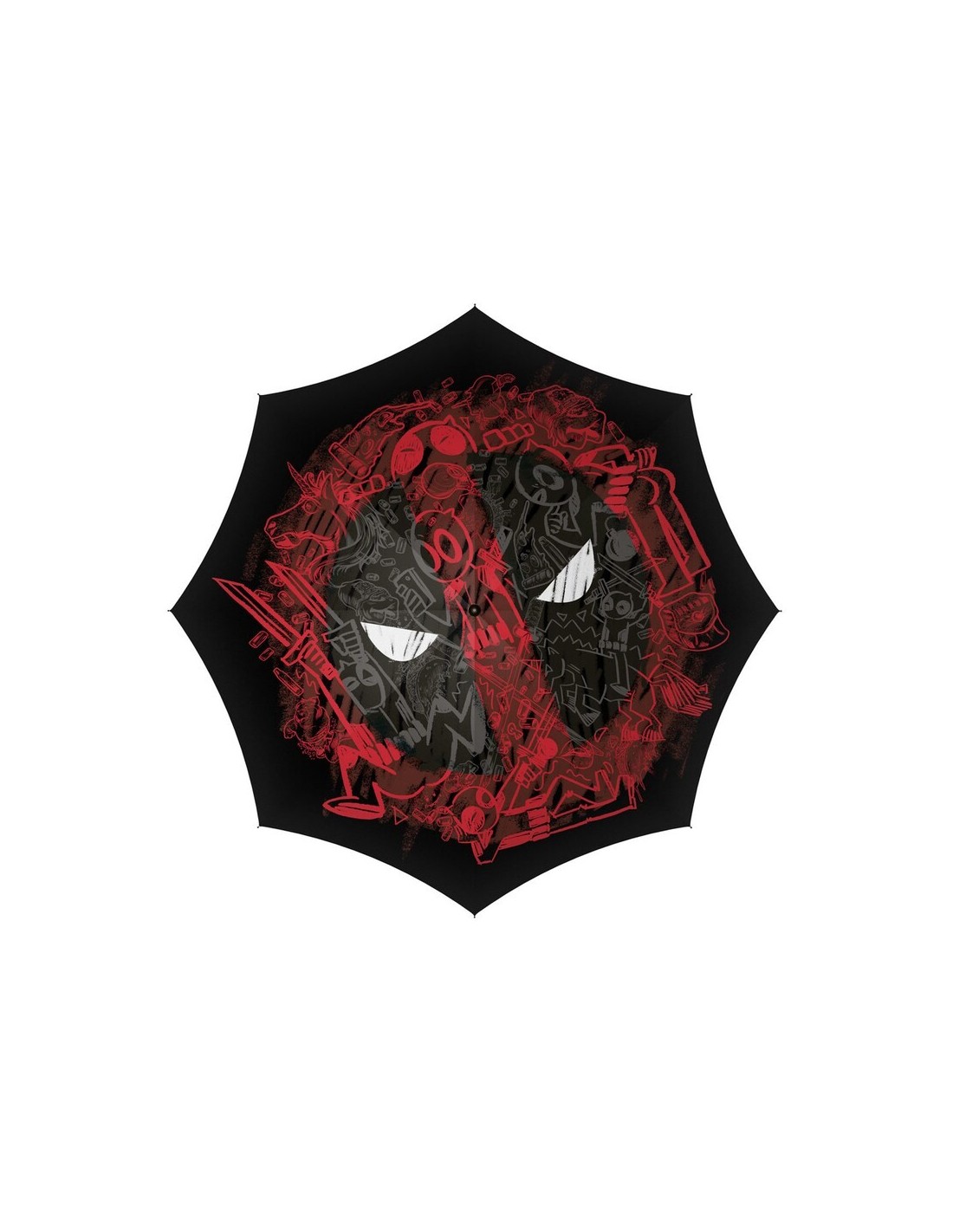 Sombrilla fabricada en poliéster con estructura de metal extensible. Mango de PVC con sistema de apertura automático. Medidas: 100 cm de diámetro y 55 cm de alto. Producto oficial. 100 % licencia Deadpool 3.
