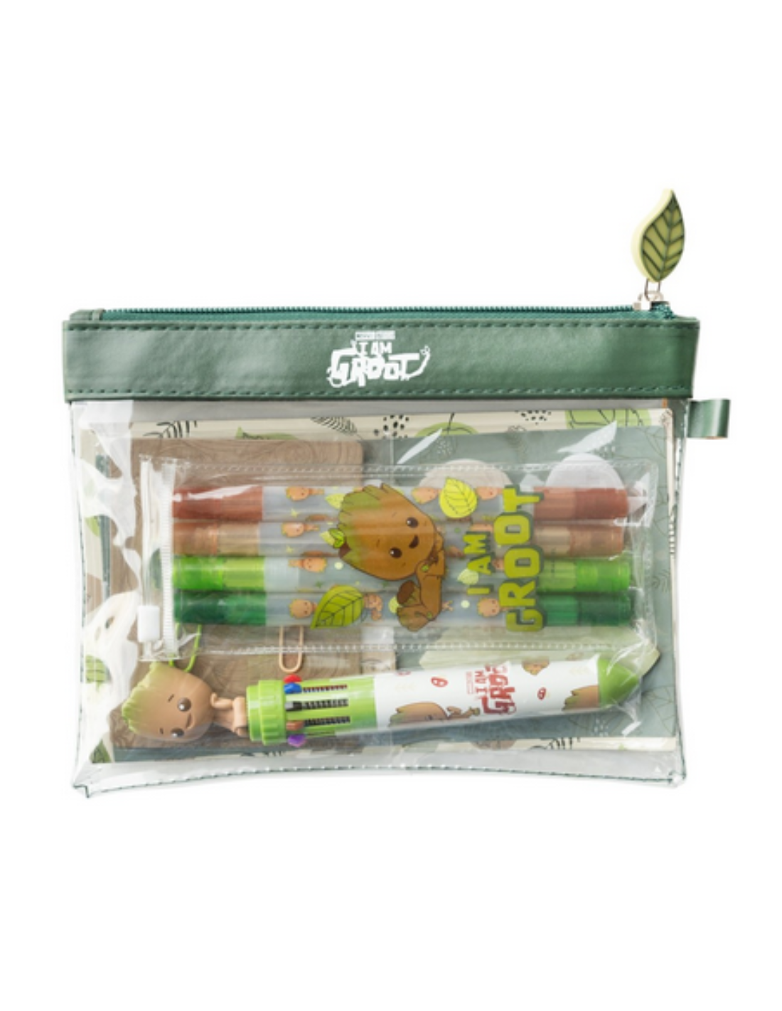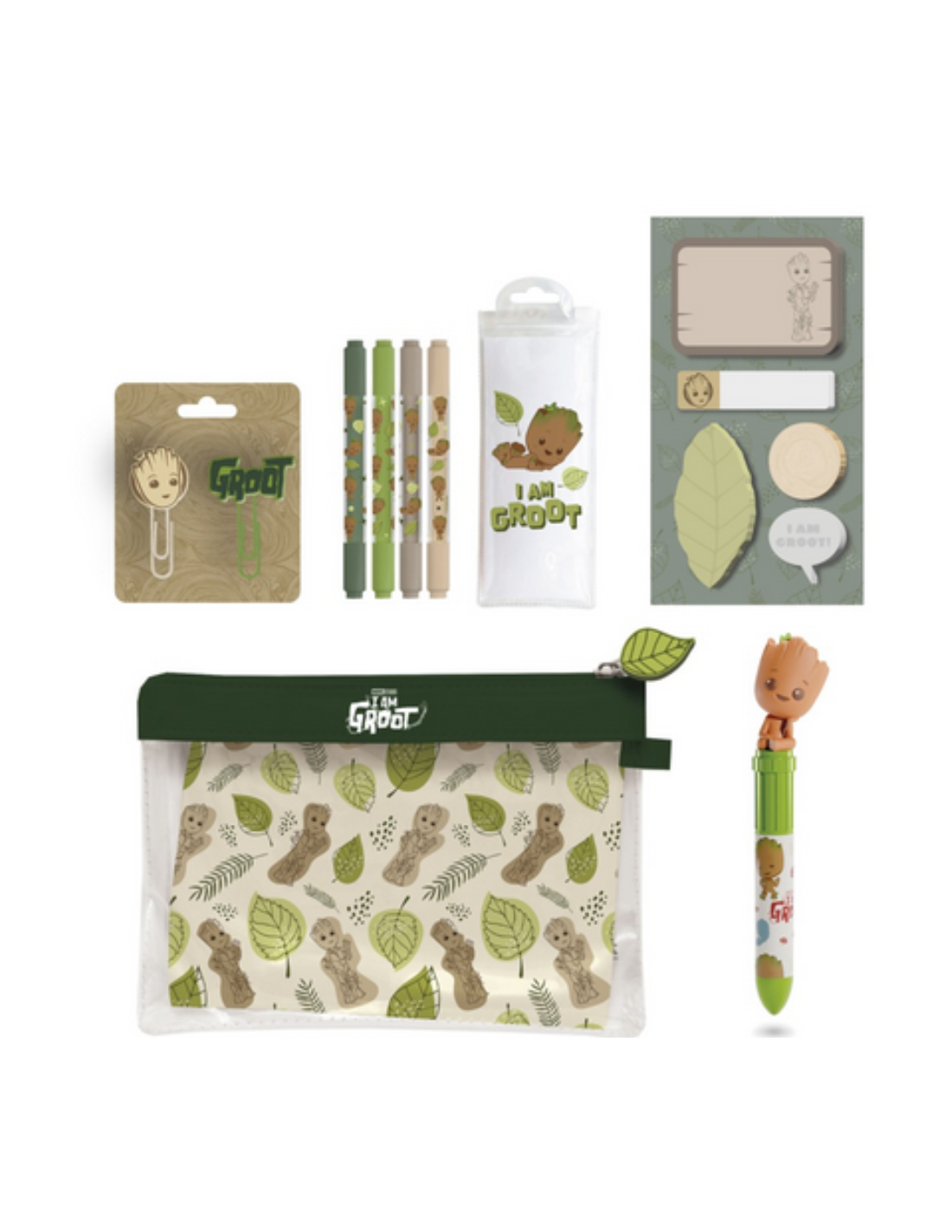 Contiene un 1 pack de sticky notes, 2 clips con topper de silicona, 1 estuche con 4 subrayadores y 1 bolígrafo de 10 colores con topper 3D. Todo ello dentro de una bolsa de PU y PCV.