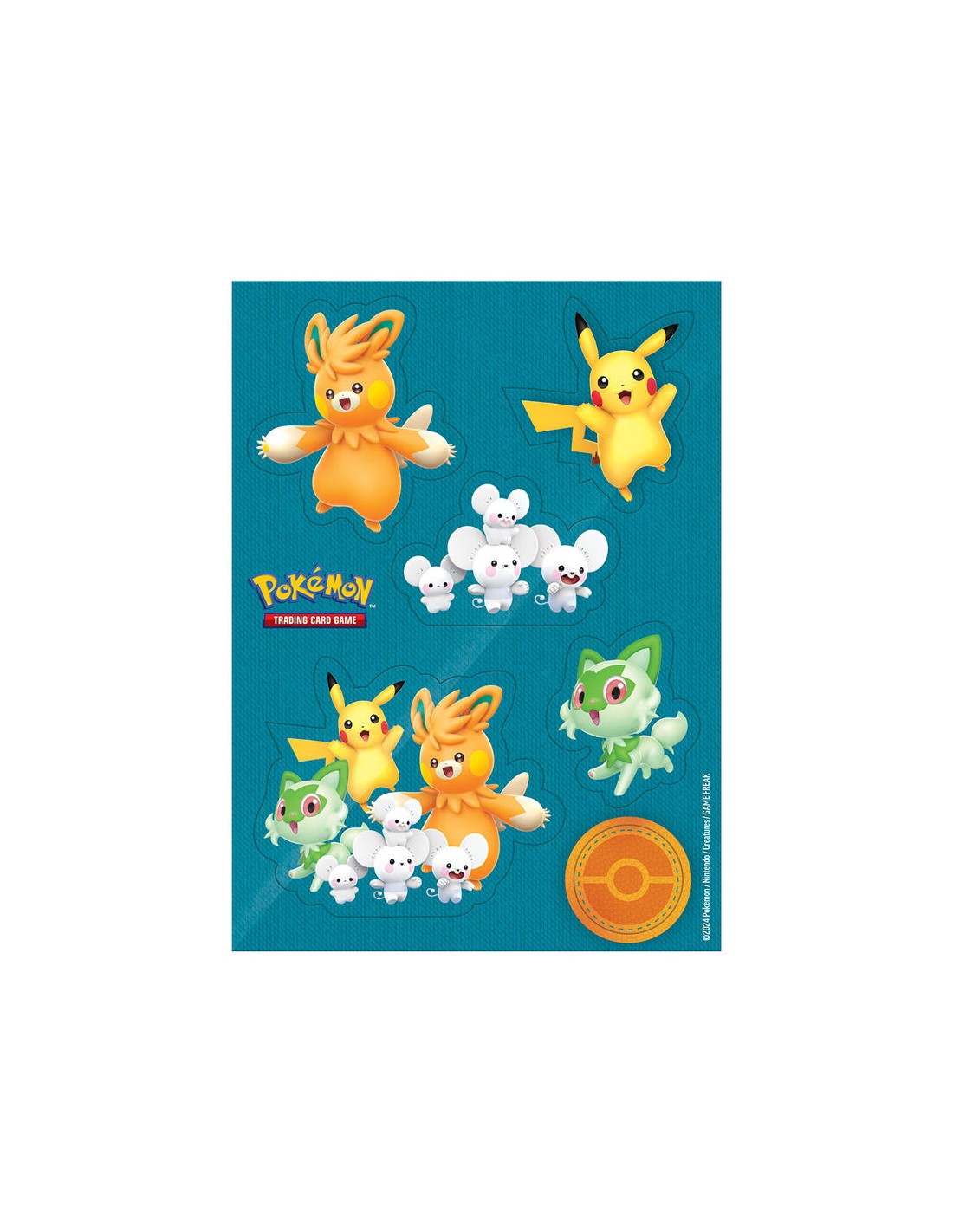 Edad: +6 años. Contiene: 7 cartas holográficas de promoción de Pikachu, Sprigatito ex, Pawmi, Pawmo, Pawmot ex, Tandemaus y Maushold ex. 1 hoja con pegatinas especiales. 1 miniálbum. 1 muñeco blandito de Pikachu. 6 paquetes de mejora de JCC Pokémon. 1 carta con código para JCC Pokémon Live.