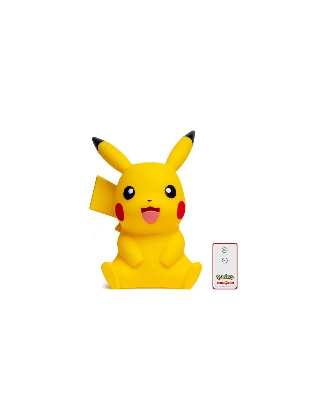 Divertida lámpara LED de Pikachu, inalámbrica, de 40 cm de alto y con control remoto y material flexible.. Tiene un botón de ON/OFF, funciona con 3 pilas AAA.